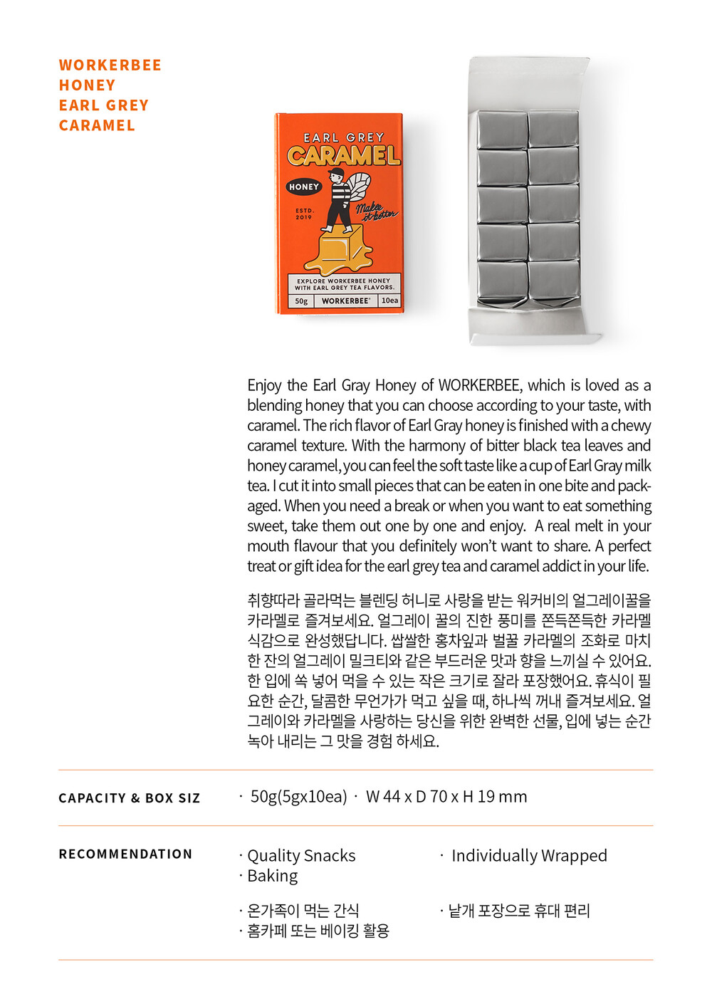 콩 한쪽도 나눠 먹는다고 배운 민족 아닙니까. 예년보다 적지만, 한 방울의 꿀이라도 맛있게 나눠 먹을 방법을 찾기 시작했고, 우리는 꿀 카라멜을 만들게 되었습니다.🍯 큰 사랑을 받고 있는 얼그레이 꿀의 진한 풍미를 쫀뜩쫀득한 카라멜 식감으로 완성했어요. 한 입에 쏙 넣어 먹을 수 있는 작은 크기로 잘라 가방이나 주머니에 담아두기 좋게 포장했어요. 휴식이 필요한 순간, 달콤한 무언가가 먹고 싶을 때 하나씩 꺼내 즐겨보세요.